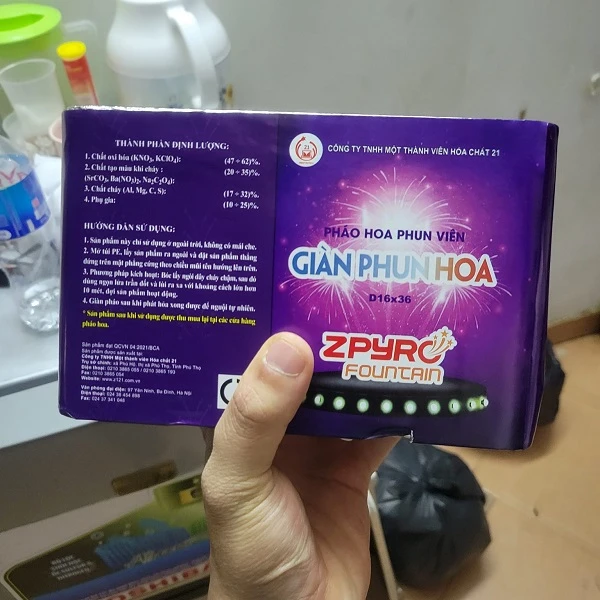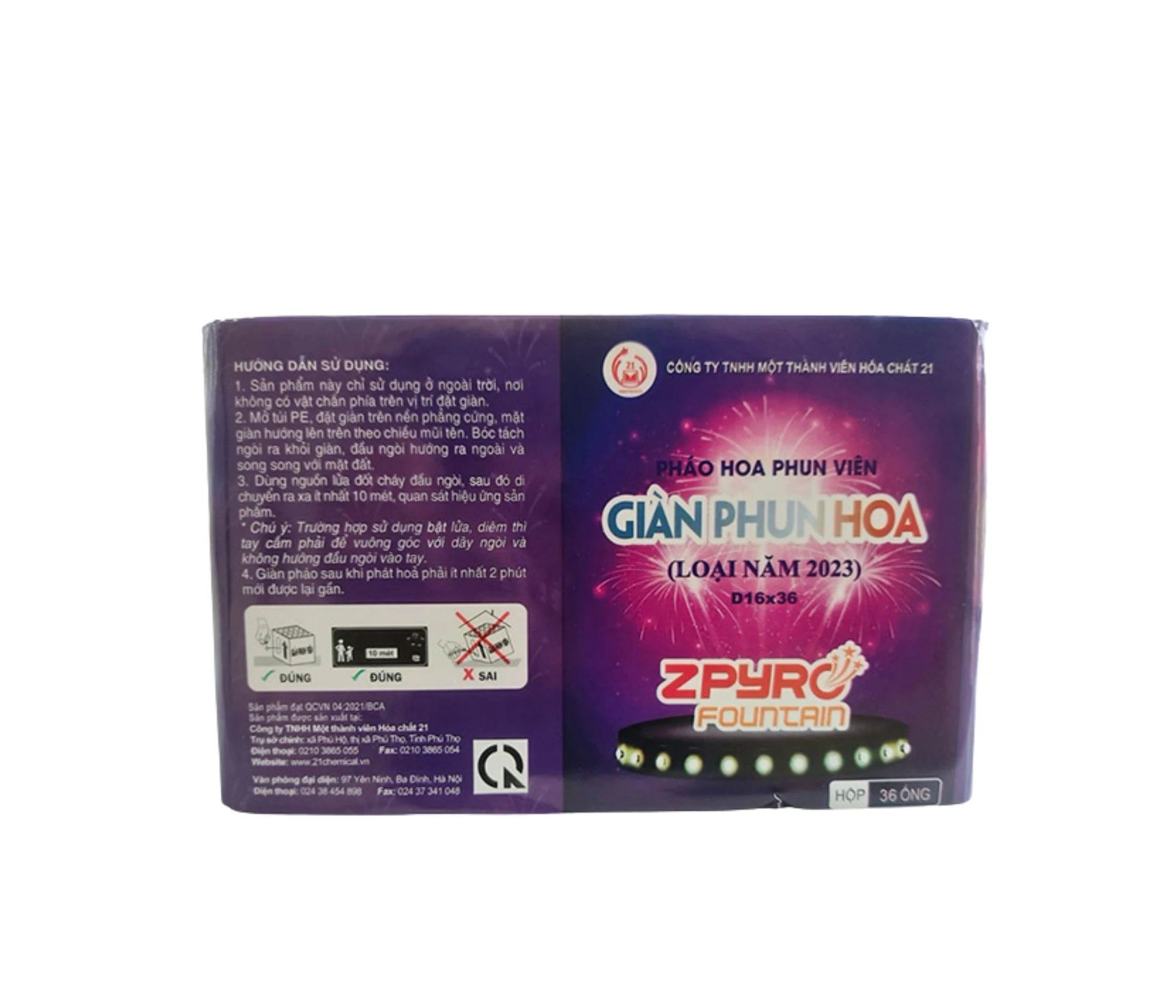 Pháo hoa – Giàn phun hoa D16x36 là sản phẩm pháo hoa không gây tiếng nổ. Khi phát hỏa, một chùm viên cháy có nhiều màu sắc (đỏ, xanh lục, xanh lơ, vàng, …) được phun lên không trung. Khi giàn pháo hoạt động, có thêm hiệu ứng tiếng nổ lách tách trên đường bay. Thứ tự bắn lần lượt từ ống số 1 đên hết.