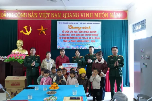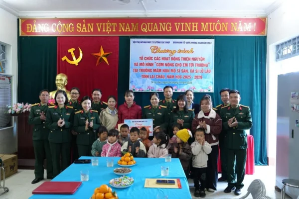 Tiếp nối chuỗi hoạt động thiện nguyện của Nhà máy Z121 – Tổng cục Công nghiệp Quốc phòng tại tỉnh Lai Châu, được sự đồng ý của Đảng ủy, chỉ huy Nhà máy, ngày 24/11/2025, đoàn công tác của Nhà máy do Hội Phụ nữ cơ sở Z121 chủ trì đã tổ chức chương trình “Bữa cơm nóng cho em tới trường” tại Trường Mầm non Mồ Sì San, xã Sì Lở Lầu, tỉnh Lai Châu. Chương trình có sự phối hợp của Đoàn Kinh tế – Quốc phòng 356, Quân khu 2.