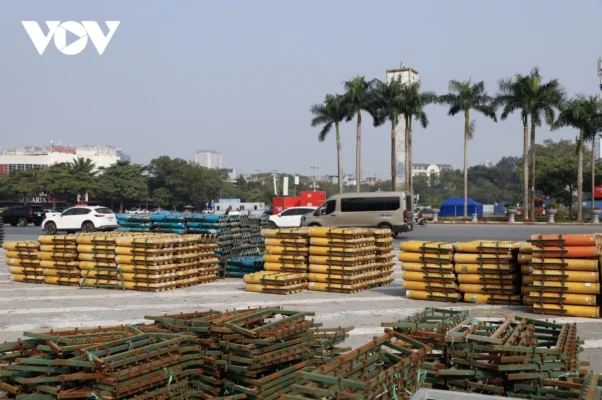 Tại hiện trường, theo ghi nhận của phóng viên, các giàn ống phóng pháo hoa tầm cao, khung giá đỡ… được xe tải vận chuyển đến đây từ ngày 11/1.