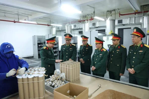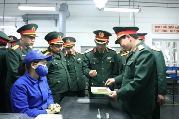 Thiếu tướng Đinh Quốc Hùng và đoàn công tác kiểm tra sản phẩm do Nhà máy Z121 sản xuất.