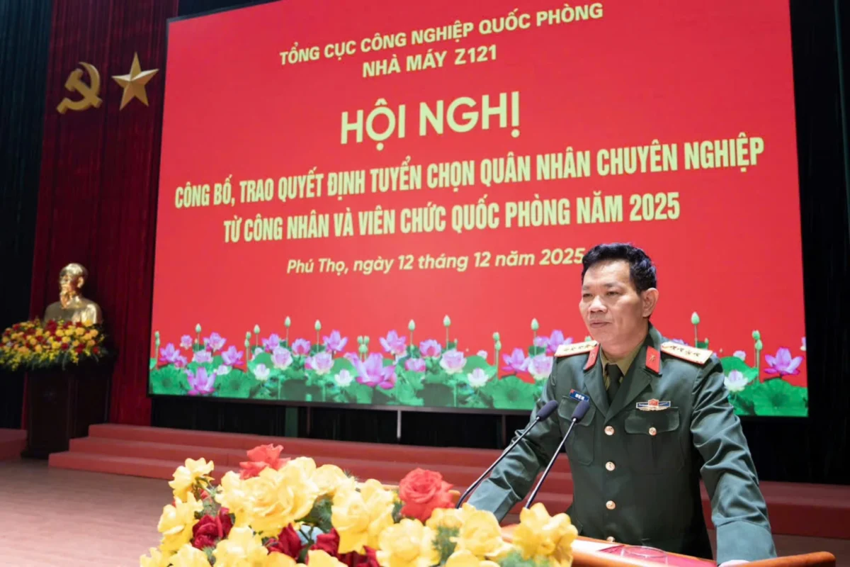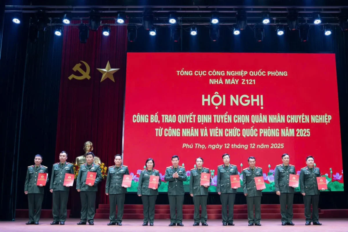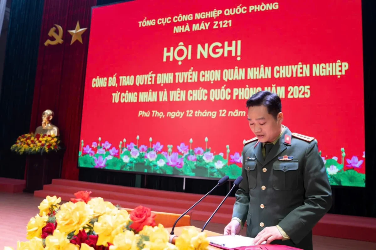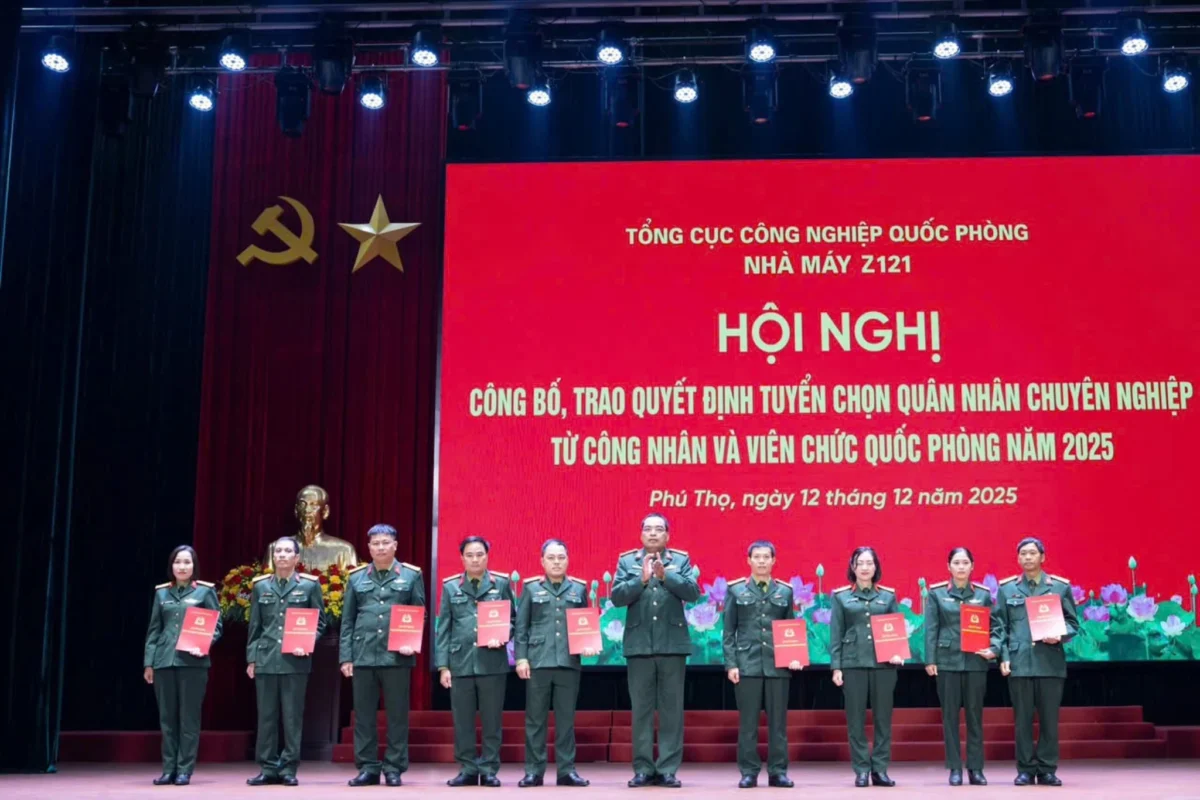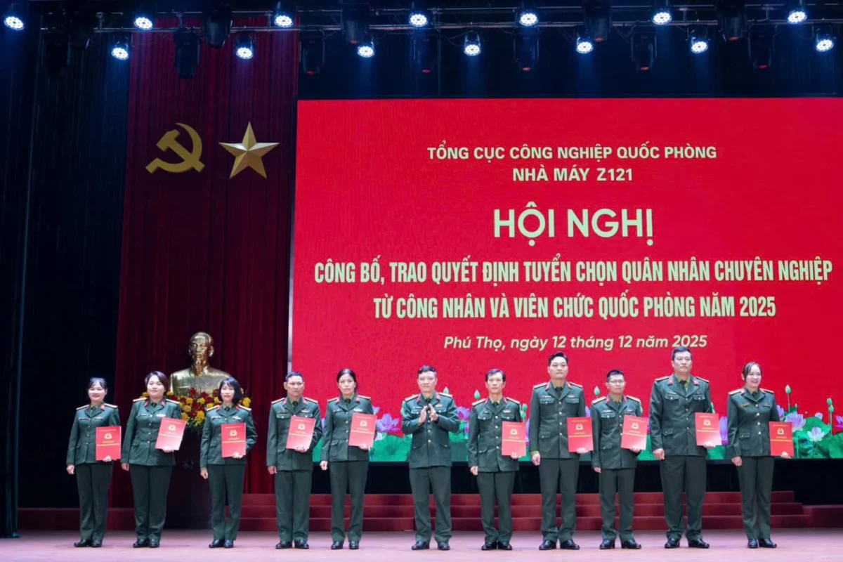 Chiều ngày 12/12/2025, Nhà máy Z121 đã tổ chức Hội nghị công bố, trao quyết định tuyển chọn quân nhân chuyên nghiệp từ công nhân và viên chức quốc phòng năm 2025.