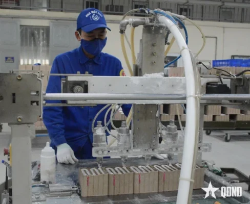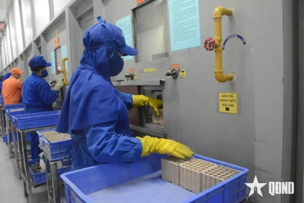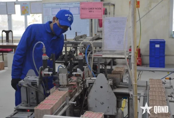 Công nhân ghép ngòi vào giàn pháo bằng máy tự động. Giàn pháo được làm từ hỗn hợp bột giấy và bột sắn có khả năng tan trong nước nên không tạo rác thải ô nhiễm môi trường.