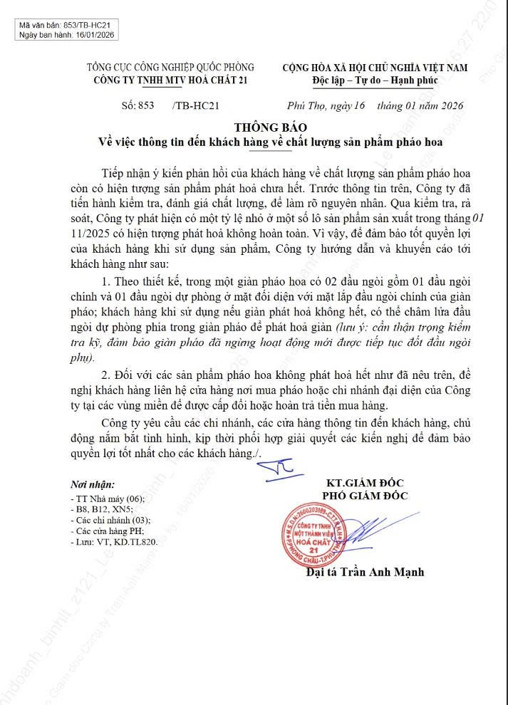 Công ty TNHH MTV Hóa chất 21 trân trọng thông tin tới quý khách hàng, đối tác và các đơn vị phân phối về vấn đề liên quan đến chất lượng một số sản phẩm pháo hoa, trên cơ sở tiếp nhận ý kiến phản hồi từ khách hàng trong quá trình sử dụng.