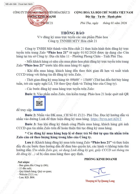 Công ty TNHH Một thành viên Hóa chất 21 thực hiện hình thức đăng ký trực tuyến trên trang Zalo “Pháo hoa 21” từ ngày 01/02/2026 được áp dụng cho Cửa hàng tại trụ sở Công ty: Địa chỉ khu 11 – Phường Phong Châu – Tỉnh Phú Thọ.